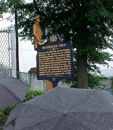 | This historical marker describes a pivotal battle of the French and Inidan War which took place in Braddock, in which General Braddock and his army were defeated. |