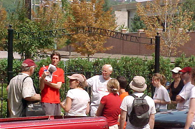| We cross East Ohio Street and walk around the Priory, a carefully-restored bed and breakfast. A staff member who happened to be in the Blumengarten stopped to talk to us. |