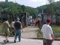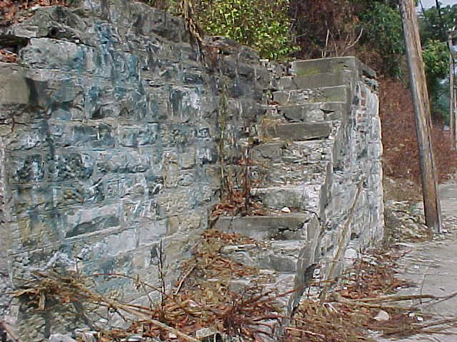 | We descend some scary steps on Rising Main Avenue. At the bottom, we walk along the deserted Howard Street. Its most prominent features now are piles of asphalt and tires stored there by the Public Works department. But you can still see evidence of the houses that lined the street years ago. |