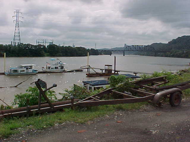 | Several boats are docked at Vic’s Boat Park on appropriately-named River Road. To the left you can see Brunot Island, which doesn’t have much on it besides a power station these days, although Meriwether Lewis once slept there. |